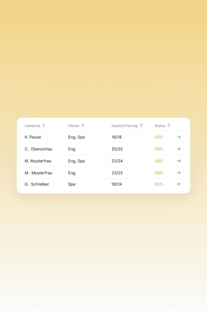 Unsere benutzerfreundliche Planungssoftware sorgt für eine effiziente und transparente Verteilung von Unterrichtsstunden und Verwaltungsaufgaben. Sie behalten jederzeit den Überblick und erkennen auf einen Blick Vertragsstunden, bereits zugewiesene Unterrichte und eventuelle Abweichungen.