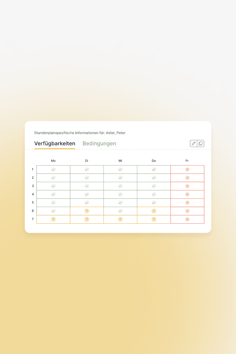 Minimieren Sie Zeit und Aufwand in der Planung durch das Erstellen von individuellen Verfügbarkeiten und Bedingungen. Diese werden automatisch beim Verschieben der Stundenkärtchen berücksichtigt und bilden die Grundlage für ein maßgeschneidertes Ergebnis unseres Stundenplan Generators.