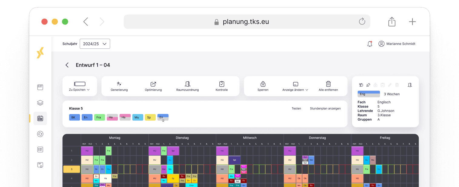 Unser Tool bietet umfassende Unterstützung für die Planung des Stundenplans. Sie haben die Wahl, ob Sie den Stundenplan automatisch generieren lassen möchten oder lieber manuell die Kärtchen setzen. Wir bieten Ihnen die passenden Werkzeuge für beide Vorgehensweisen.