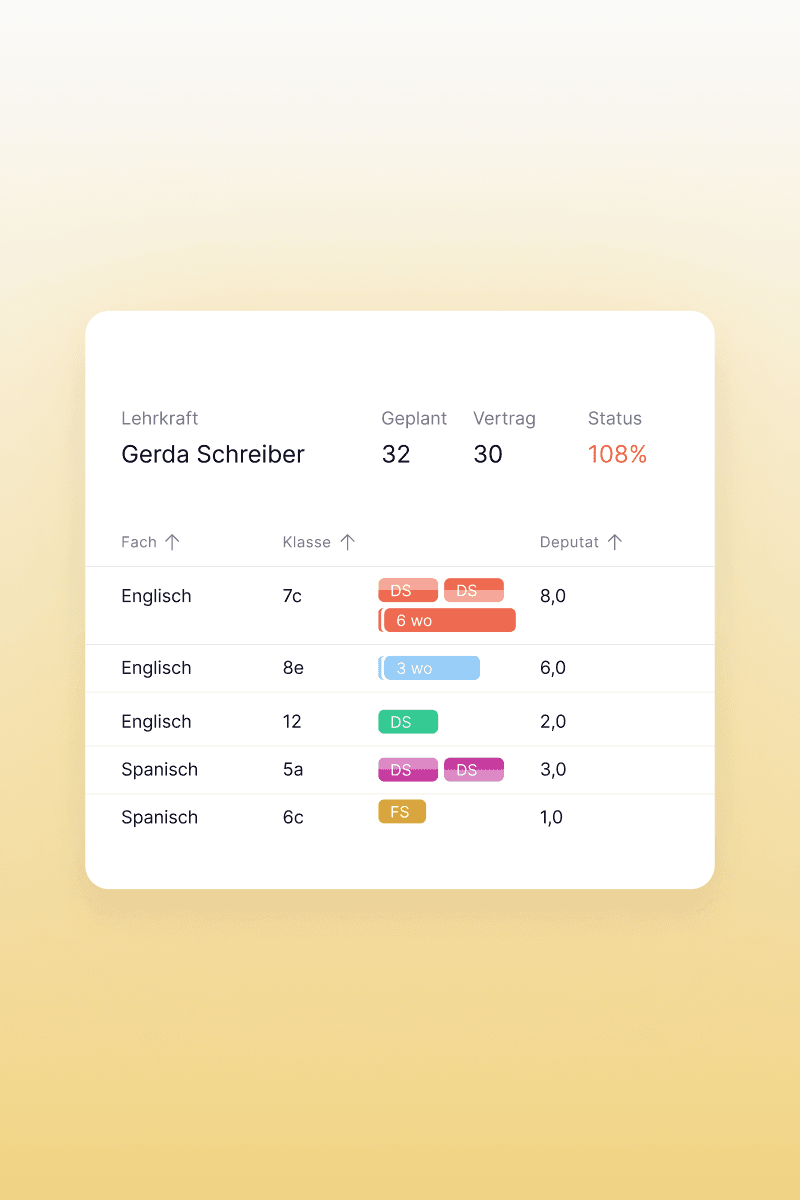 Die Software berücksichtigt individuelle Faktoren wie Gewichtungen, Lehrbefähigungen und spezifische Anforderungen Ihrer Schule. So wird die Deputatsplanung genau auf Ihre Bedürfnisse zugeschnitten und erleichtert die gerechte Verteilung der Aufgaben.